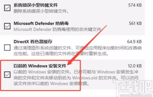在“磁盘清理”窗口中,勾选“以前的Windows安装”选项。