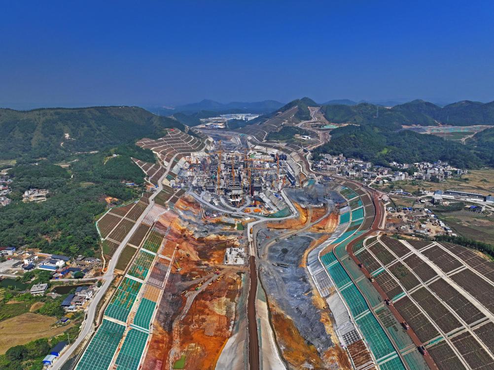 2024年11月7日拍摄的位于广西钦州市灵山县旧州镇的平陆运河马道枢纽建设现场(无人机照片)。新华社记者周华摄