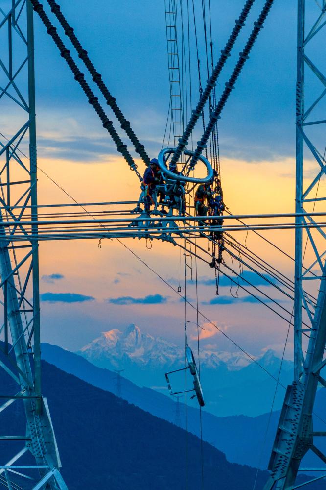 2024年10月14日,在四川省甘孜藏族自治州泸定县,施工人员在川渝1000千伏特高压交流工程进行附件安装作业。新华社发(田海摄)