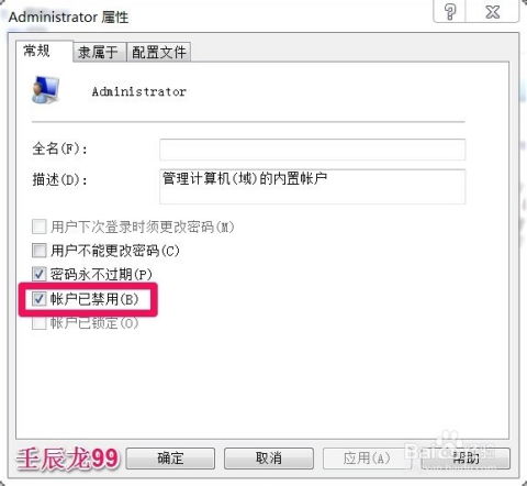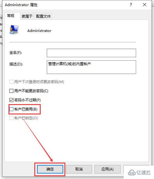 在“账户已停用”选项前取消勾选,然后点击“应用”和“确定”。