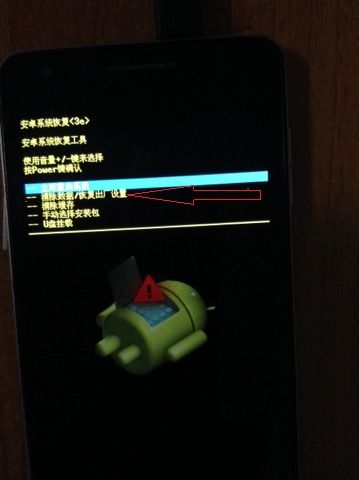 4. 选择恢复方式:在恢复模式中,选择“Wipe Data/Factory Reset”或“Wipe Cache Partition”,然后确认。