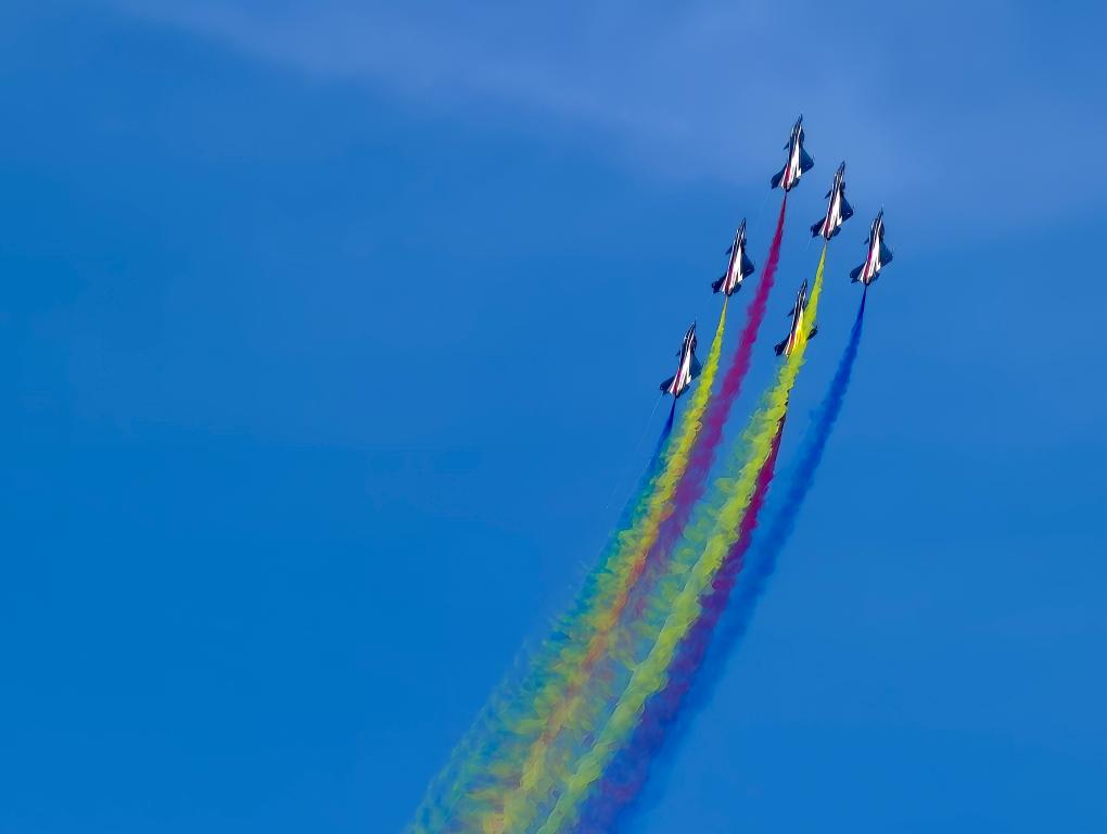 轰鸣声由远及近,空军八一飞行表演队在白云间“画出”的绚丽“彩旗”,仿佛诉说着:蓝天之上,中国人正在书写新的传奇。(记者宋晨)